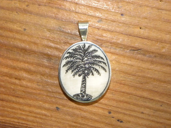 The 'Palm' pendant. Royal Palm scrimshawed on Mastadon Ivory. Sterling silver pendant case.