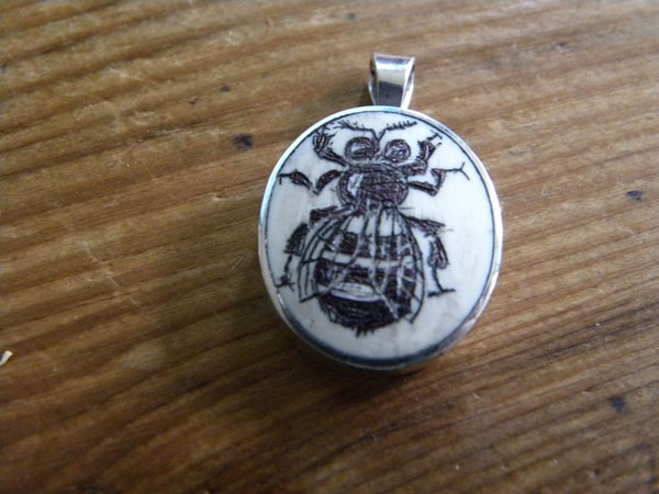 The 'Bee' pendant. Queen Bee scrimshawed on Mastadon Ivory. Sterling silver pendant case.