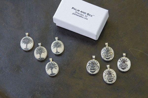 Mr. McDowell has been producing a limited amount of Palm and Bee pendants since 1959. Initially created for friends in Princeton, NJ., an enduring word of mouth following has made the Palm and Bee pendants quietly popular ever since whether as Christmas, wedding, birthday, or Valentine presents, or for any occasion that warrants a special gift. Pendants measure 1.125 inches in height by .75" in width, and are typically worn on a chain around the neck or on bracelets, as an individual, classically understated piece of jewelry.