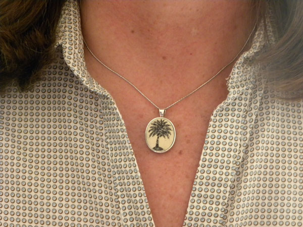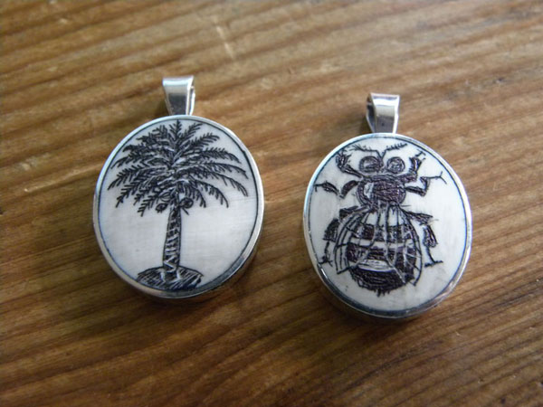 The classic Palm and Bee designs on these elegant sterling silver and mastodon ivory pendants, are scrimshawed by hand; no two are alike; each is signed by renowned American folk artist Sam McDowell.